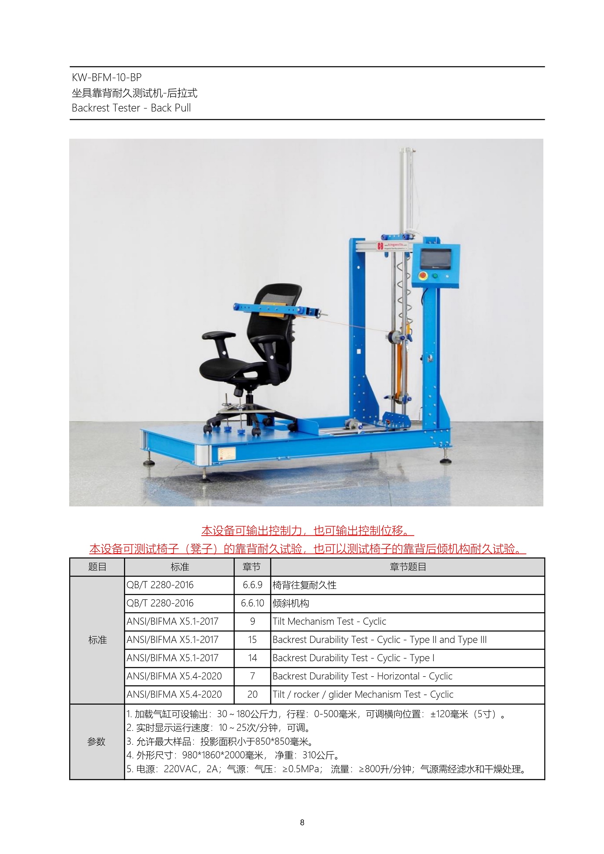 1. 符合GB BIFMA標準的座具靠背耐久試驗機;